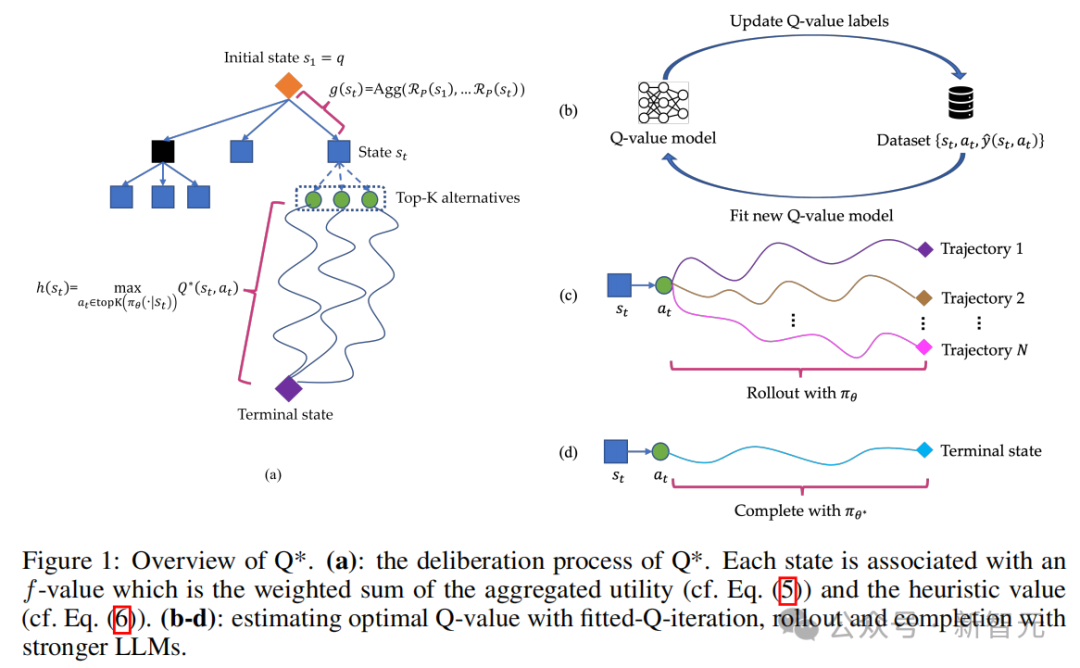 在《Q*: Improving Multi-step Reasoning for LLMs with Deliberative Planning》论文中,研究人员首先将大语言模型的推理轨迹分解为若干个状态。对于每一个状态,参考DeepCubeA中的设计,通过将定义Path Cost的g(s_t)函数和定义Accumulated Reward的Q*(s_t, a_t)集成到同一个f(s_t)函数内,实现了对历史状态收益和未来期望收益的综合考虑。最后利用A*搜索算法对状态进行最佳优先搜索,实现了对复杂推理任务的全盘规划,从而提升开源模型在推理任务上的性能。其中g(s_t)表示当前轨迹中的多个历史状态,既{s1,...,s_t},的聚合收益。具体g(s_t)的函数形式可以通过人为定义,例如判断当前代码是否符合语法规则等,或者通过构建 Process Reward Model(PRM)进行监督学习得到;g(s_t)中的聚合方式可以为求和,最大值,最小值等。为了获得状态-动作对(s_t, a_t)的最优Q值以实现规划,研究人员在当前LLM策略生成的数据上通过监督学习的方式训练了一个代理Q值模型