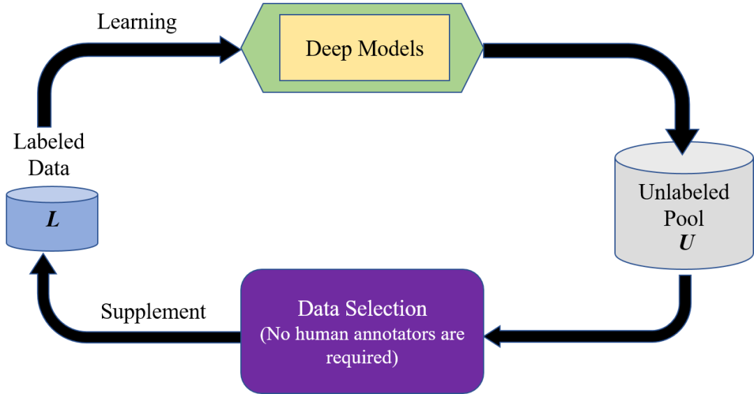 SSL 流程概述。与主动学习不同,SSL 不需要用户参与选择数据。所选数据用于扩大原始标记数据集,是否使用伪标签取决于所采用的训练策略(例如,伪标记策略或一致性策略)。