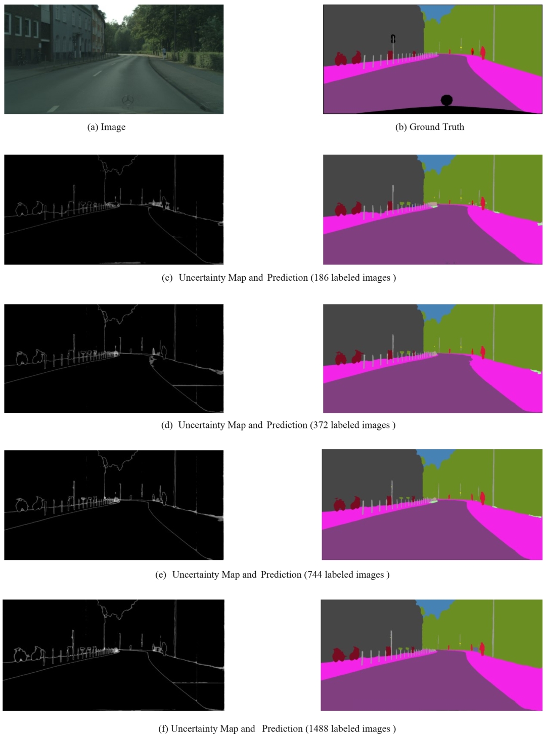 第三组在不同训练协议下对 Cityscapes 的可视化结果。图中显示了预测及其对应的不确定性图。