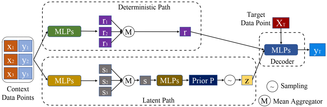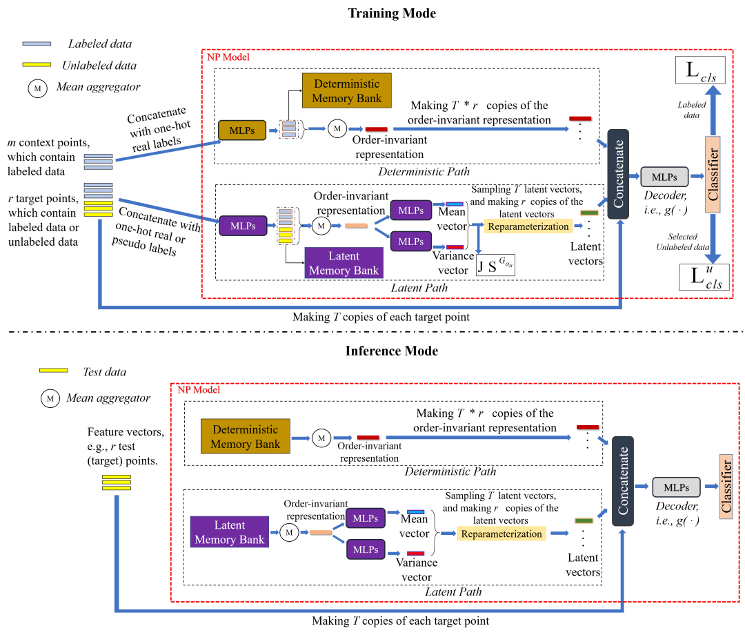 NP-Match 概述。NP 模型显示在红色虚线框中,其输入特征向量来自卷积神经网络 (CNN) 中的全局平均池化层。为简单起见,图中省略了 CNN。