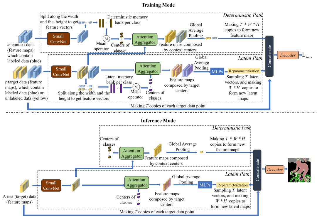 NP-SemiSeg 概述。小型 ConvNet 和注意力聚合器均由确定性路径和潜在路径共享。T、W 和 H 分别表示采样的潜在向量数量以及输入特征图的宽度和高度。