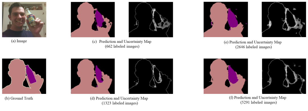 第二组可视化结果在 PASCAL VOC 2012(blender)上根据不同的训练协议得出。图中显示了预测结果及其对应的不确定性图。