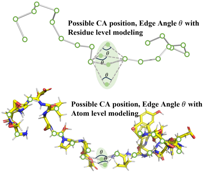 尽管许多预先训练的模型已经成功地模拟了蛋白质的3D结构,但大多数模型都集中在残留物水平上,仅利用α碳原子或主链原子的几何位置。然而,侧链原子在许多下游任务中也是必不可少的,例如分子对接,因为它们与小分子相互作用。因此,在蛋白质建模中整合来自所有原子的信息是必要的。在作者的实证研究中,发现寻常的原子级建模通常会失败:(1)简单地将残差输入替换为原子输入,在原子级进行预训练任务,而不考虑残差级别,例如预测原子坐标和角度,并没有产生显著的改进。这表明基于残留物的建模是必不可少的。(2)单纯地将残基和原子信息结合起来,同时在原子和残基层面进行预训练任务,并不能提高性能。