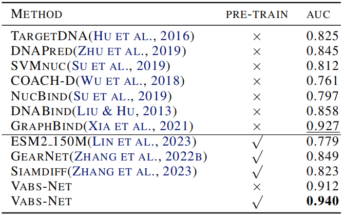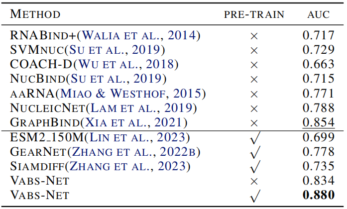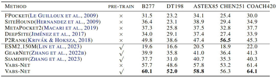 表2、表3和表4提供了预训练模型和未预训练模型在结合位点预测上的结果。作者发现,Vabs-Net在所有基线模型中表现最佳。结合位点预测的基线模型通常没有经过预训练,因此作者将未预训练的Vabs-Net与表现最好的基线模型进行了比较。结果显示即使在未预训练的情况下,Vabs-Net的性能也能与最好的基线模型竞争,这证明了该骨干网络的有效性。此外,结合预训练后,性能显著提升,远超其他预训练模型。对比其他预训练模型和未预训练的最佳基线模型,显示了方向编码的重要性。