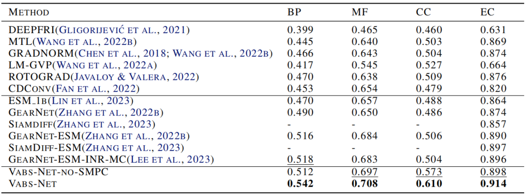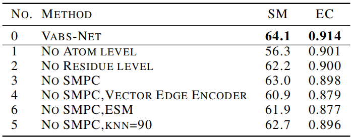 作者模型在BP、MF、CC和EC任务上的结果见表1,表明Vabs-Net模型在这些任务上的性能显著优于所有基线模型。与GearNet-ESM相比的显著提升证明了原子级别编码的有效性。超过Siamdiff-ESM的优异表现显示了残基级别编码的重要性以及所提出的SMPC预训练策略在学习高效残基级别表示方面的有效性。为了进一步验证SMPC的有效性,作者比较了在预训练过程中有和没有整合SMPC的模型。结果表明,整合SMPC有助于有效的残基级别表示学习。