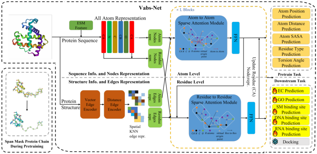 如图2所示,作者提出了一个向量感知双层稀疏注意网络(Vabs-Net),这是一个同时对残基和原子建模的预训练模型。Vabs-Net采用精心设计的边缘矢量编码模块和由原子-原子轨道和残基-残基轨道组成的双轨道稀疏关注模块对原子和残基进行编码。这些轨迹通过碳原子相互作用。为了确保残差水平上的任务是有意义的,作者采用了SMPC预训练策略。在原子水平上,作者采用随机噪声策略。通过一系列的结构预训练任务,如位置和扭转角预测,作者的模型有效地学习残基和原子表示,从而在两个层面上实现全面的蛋白质建模。