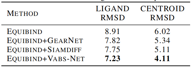 表5展示了从各种结构蛋白预训练模型中提取的特征在分子对接任务中的效果。结果表明,作者的模型获得的原子和残基表示优于其他预训练模型。通过结合原子级别编码,模型表现出比GearNet更优异的性能。该模型和Siamdiff都优于GearNet进一步强调了原子级别编码的重要性。由于SMPC预训练方法有助于学习更精细的残基级别表示,Vabs-Net模型在性能上超过了Siamdiff。