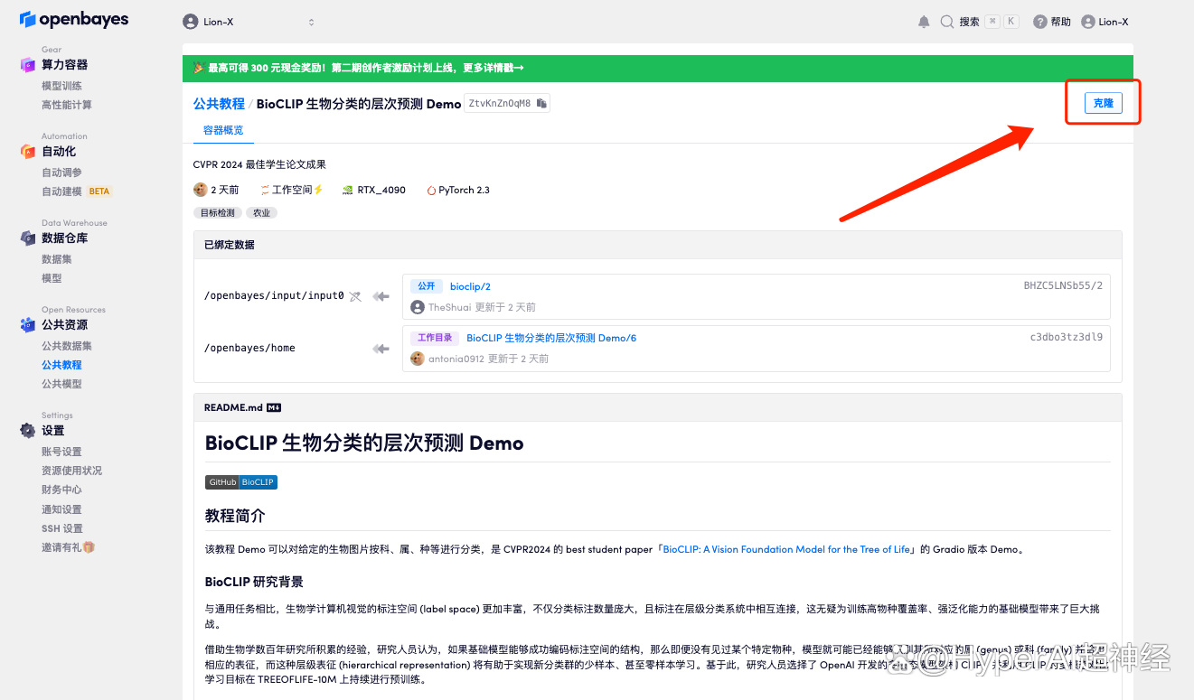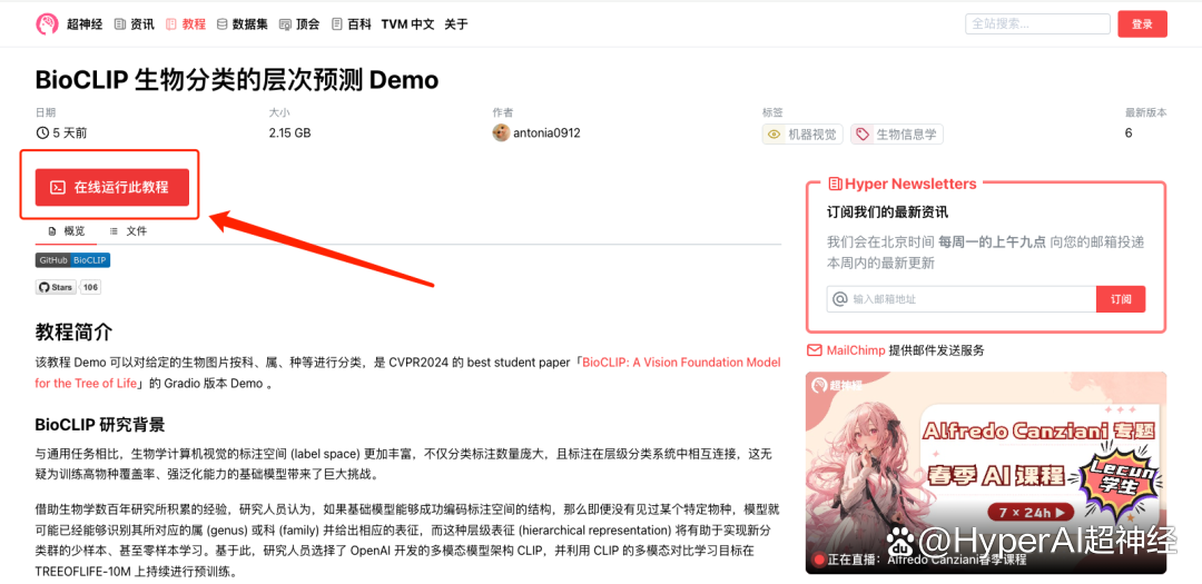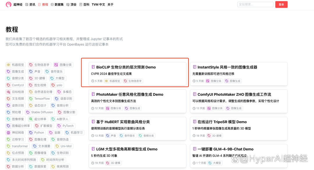 1. 登录 hyper.ai,在「教程」页面,选择「BioCLIP 生物分类的层次预测 Demo」,点击「在线运行此教程」。