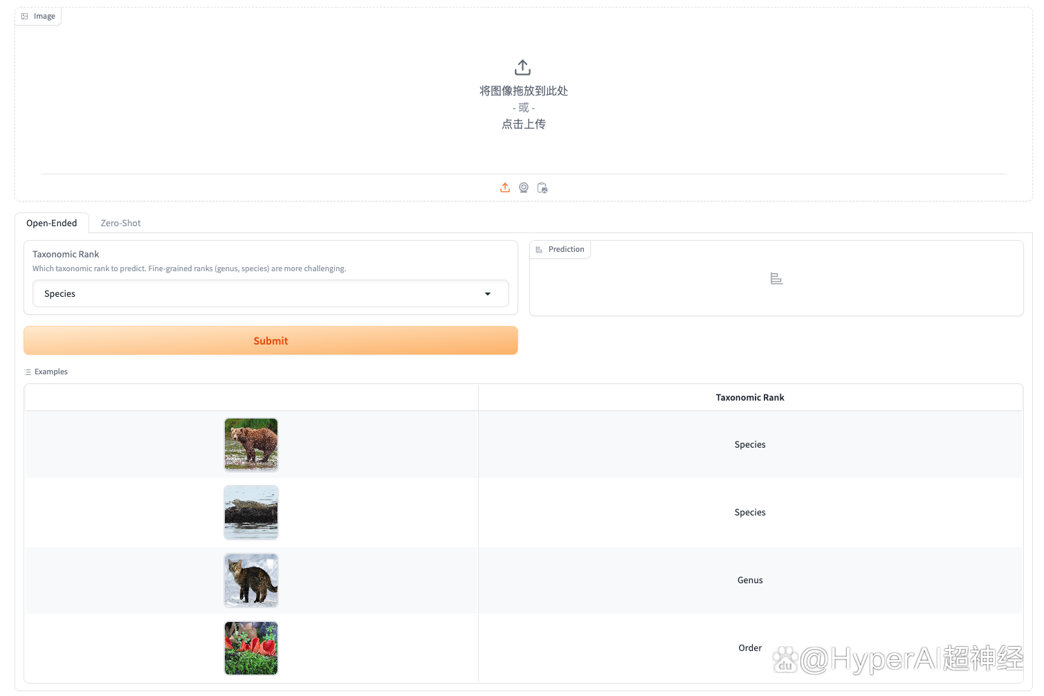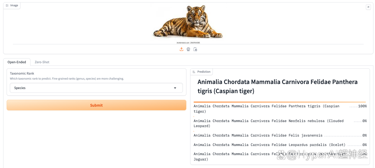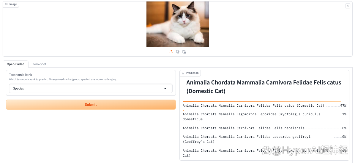 1. 打开 BioCLIP 生物分类的层次预测 Demo 页面,上传一张动物照片,点击 Submit,稍等片刻即可输出结果,可以看到它成功识别出了图中生物为猫。