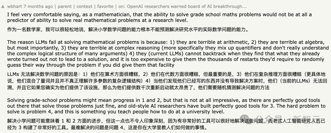 Hacker News论坛上曾有数学家发文,表示GSK8k这种小学数学应用题级别的测试根本不能衡量LLM的实际数学能力。