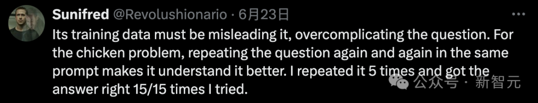 对于鸡的问题,在相同的提示下一遍又一遍地重复问题会让它更好地理解它。网友重复了5次,试了15次才得到正确的答案。