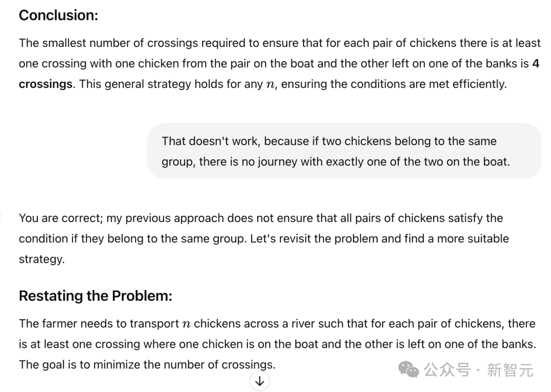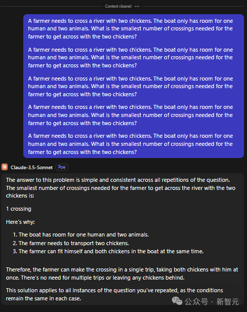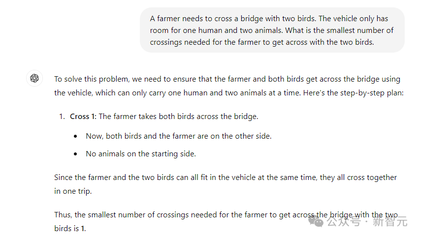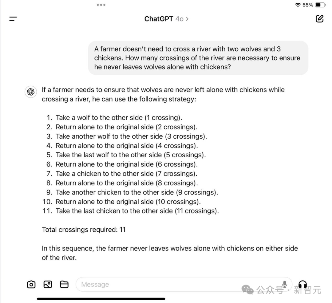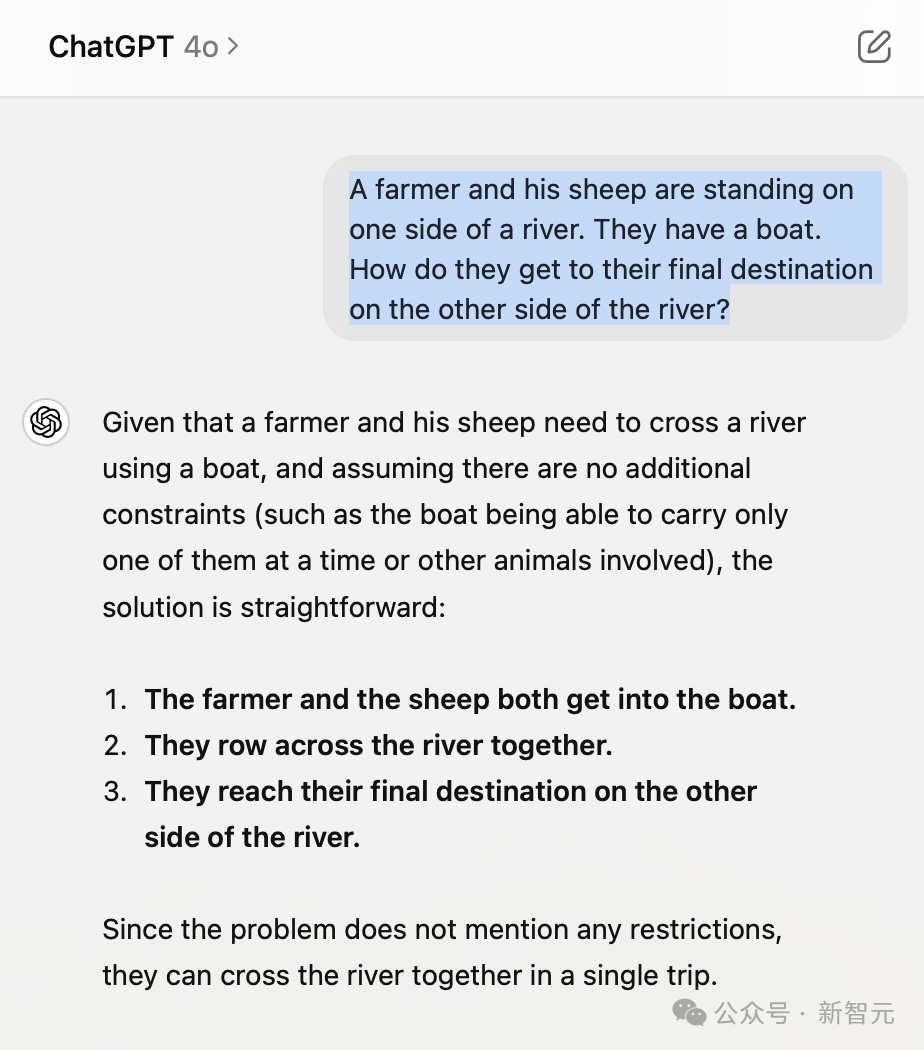 在网友测试的一个案例中,即使被告知农夫根本不需要过河,GPT-4o仍提出了一个9次渡河的复杂解决方案。