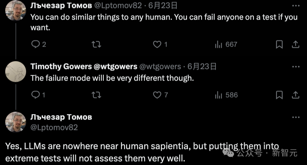 他表示,你可以对任何人做类似的事情。如果你愿意,可以让任何一个人不及格。LLM与人类的智商相去甚远,但把它们放在极端的测试中不会很好地评估它们。