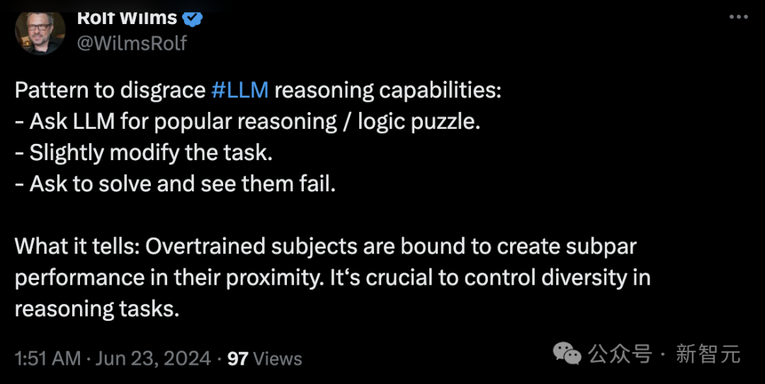 比如上面那个提出用「装水问题」测试LLM的Rolf小哥就表示,根本原因是模型的过度训练(也可以理解为过拟合),需要引入多样化的推理任务。