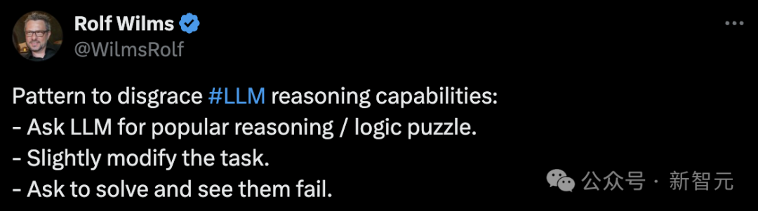 他总结道,如果想要羞辱LLM的推理能力,只需要挑一些流行的推理/逻辑谜题,稍微修改一下语言表述,你就能搬起小板凳狂笑了。