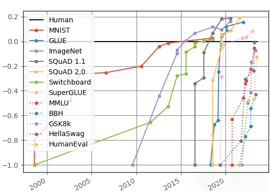 几乎是每提出一个新的测试集,模型就能迅速达到人类水平(图中0.0边界)甚至超越,其中不乏非常有挑战性的逻辑推理任务,比如需要复杂多步骤推理的BBH(Big-Bench Hard)和数学应用题测试集GSK8k。
