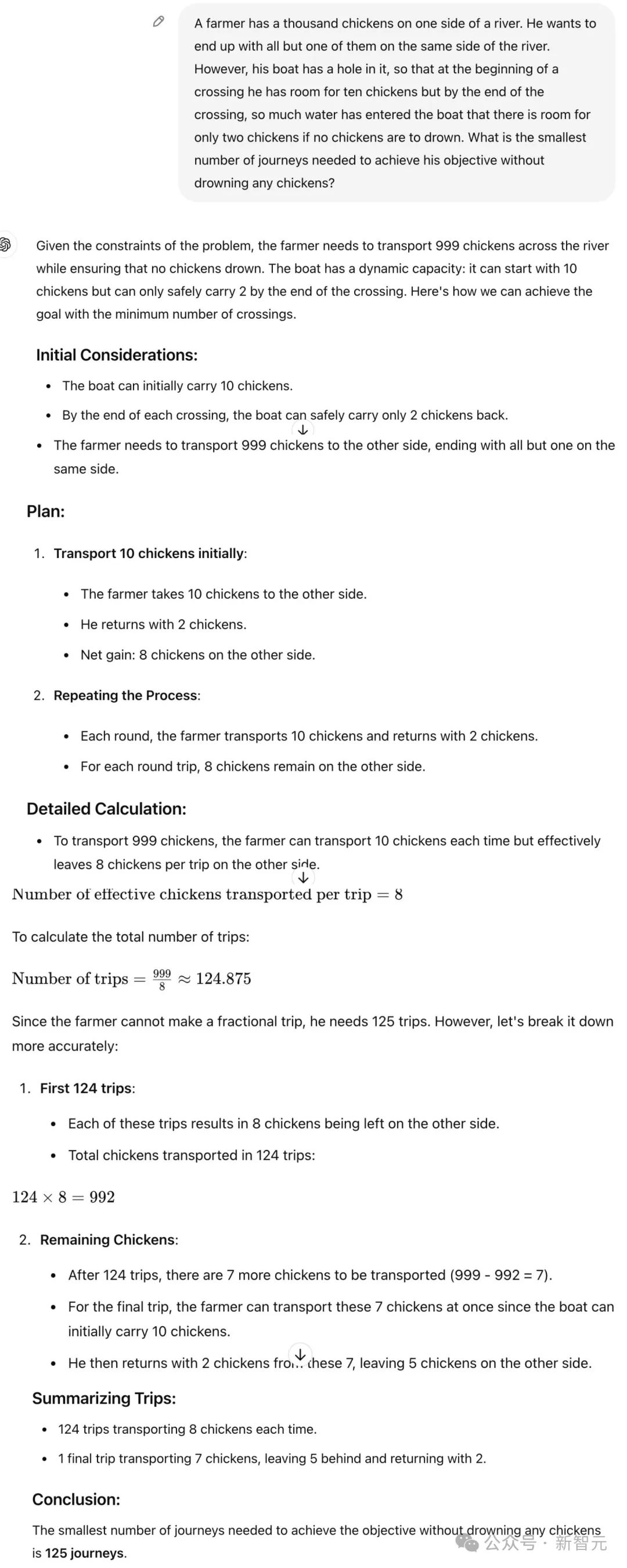 然而,他的船上有一个洞,所以在每次渡河开始时,他可以带上十只鸡。但到渡河快结束时,船里进了太多水,如果不想让任何鸡溺水,就只能容纳两只鸡。