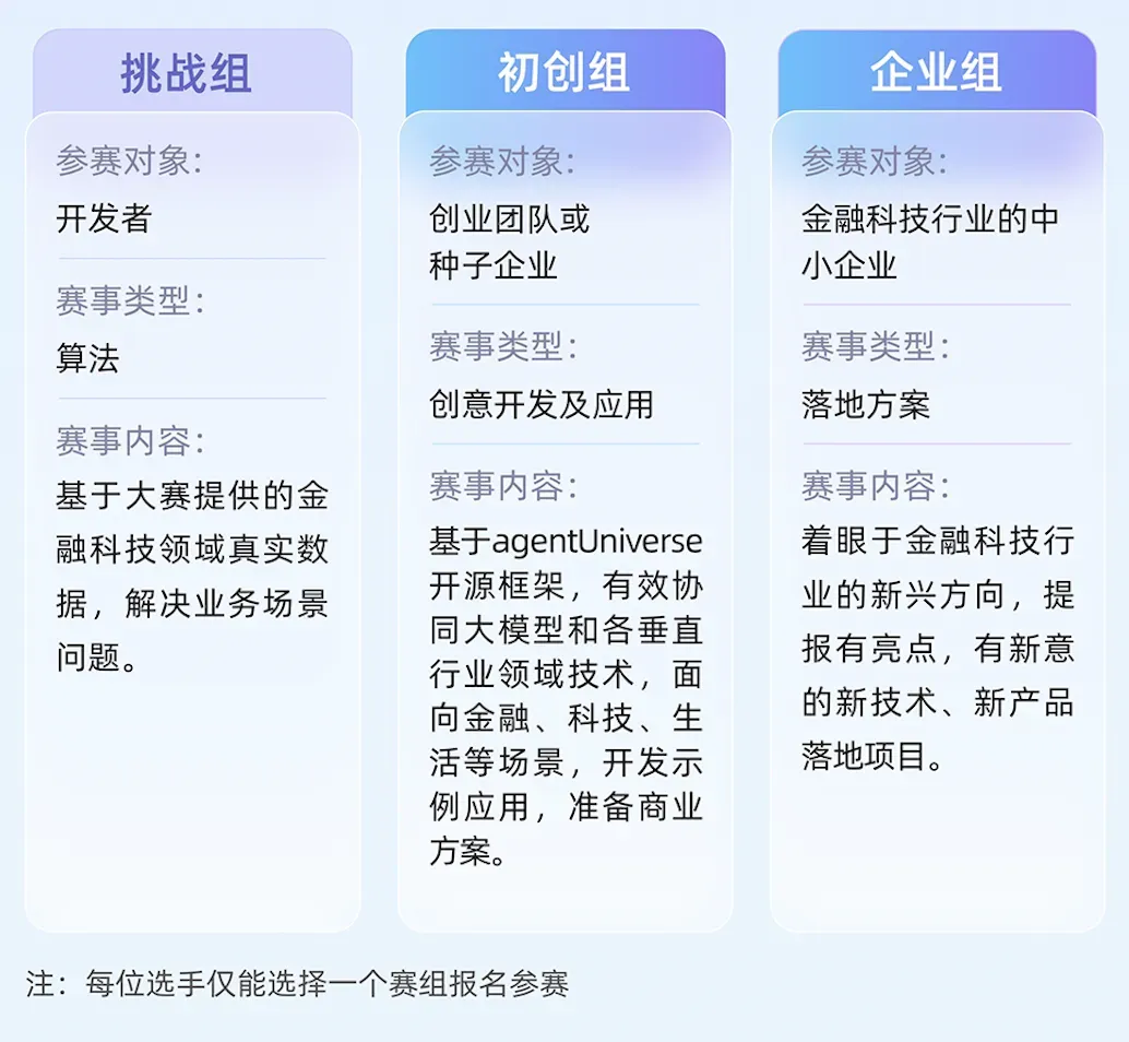 以「挑战组」为例,基于大赛提供的金融科技领域真实数据,解决业务场景问题,设置了“金融工具学习、基于保险条款的问答、AIGC金融多模态研究报告智能生成、金融规则长文本中的矛盾识别与漏洞发现”四大赛题。