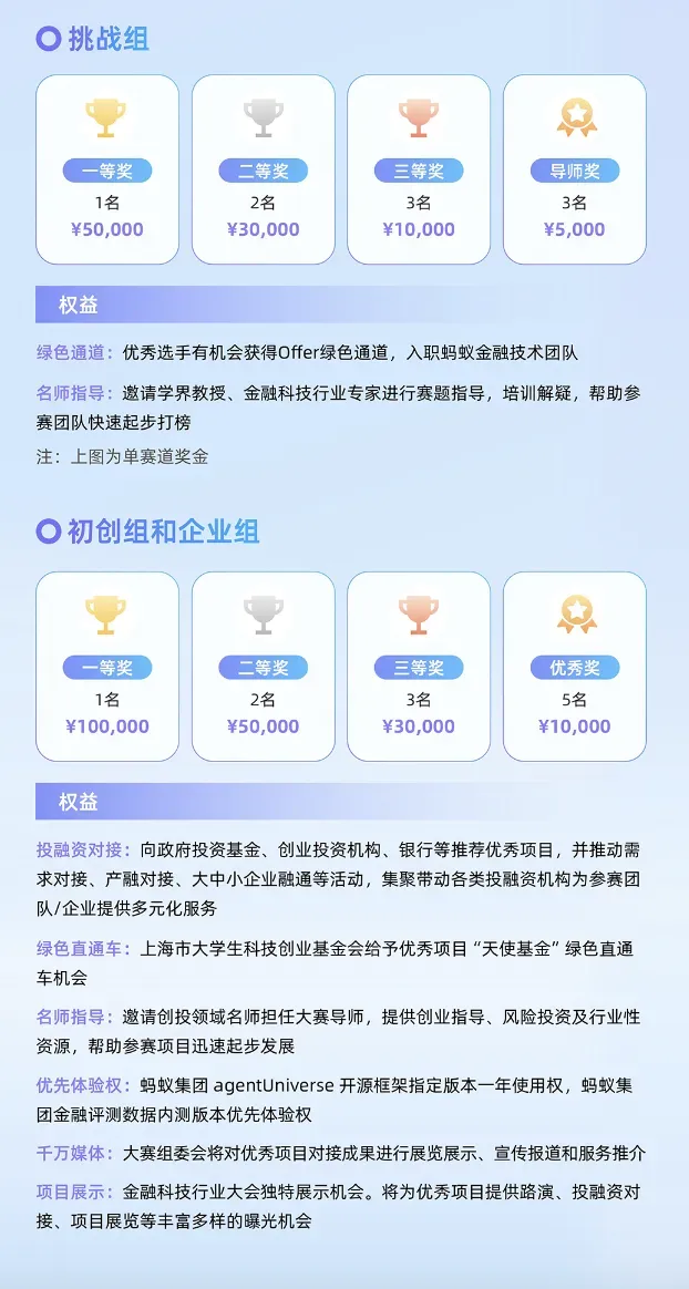 本次「初创组」推荐参赛者尝试ESG报告智能解读与分析、金融事件的历史/实时识别与解读、投资策略智能探索、旅行规划智能助理、智能客服系统五大方向的应用案例开发,同时也支持参赛者根据自身研究方向、研究热点等自行拟定选题。值得期待的是,在「初创组」,蚂蚁集团在本次大赛中提供多智能体框架agentUniverse,旨在帮助参赛者更快搭建智能体协同机制。