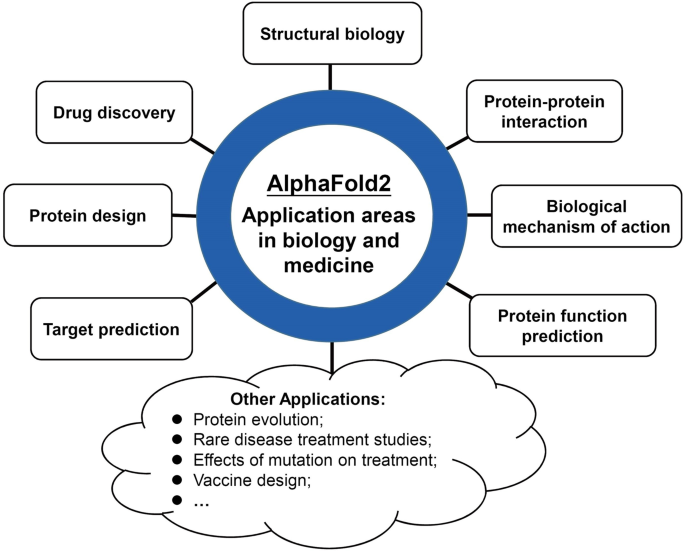 如今AlphaFold2已经用于可应用于生物和医学的多个领域,包括结构生物学、药物发现、蛋白质设计、蛋白质-蛋白质相互作用、靶点预测、蛋白质功能预测、生物作用机制等(如蛋白质进化、罕见病治疗研究、突变对治疗的影响、疫苗设计)等。