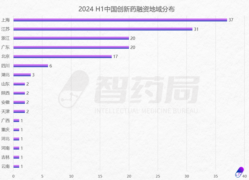 跟随着融资环境和产业政策的差异,中国创新药融资地域分布呈现出东强西弱、南强北弱的格局。