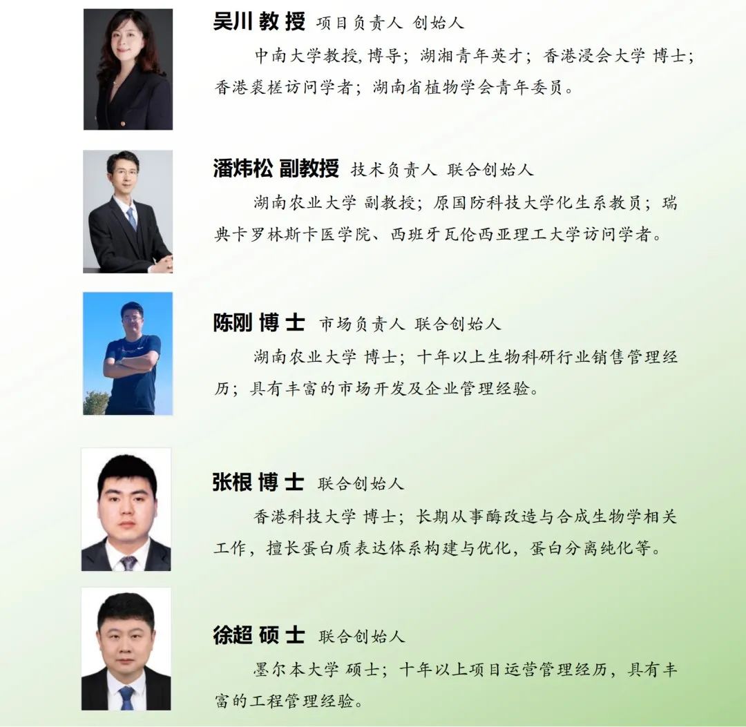 联合创始团队则出自中南大学,湖南农业大学、香港科技大学等多所高校,研发团队现有教授1人,副教授1人,博士学历人员5人,授权发明专利10余项。