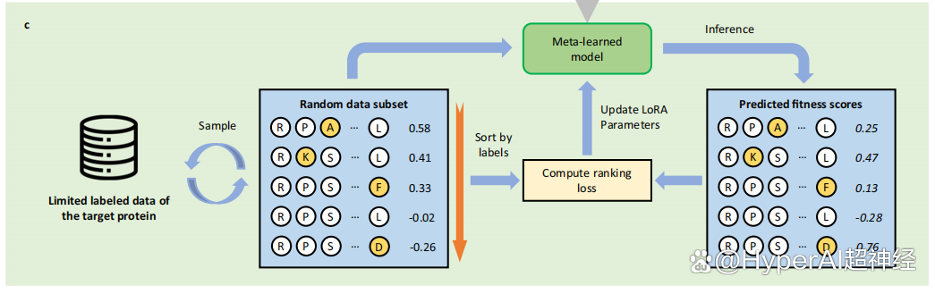 在元训练后,该研究可以得到基于 LoRA 参数的初始化,并最终将元训练好的 PLMs 转移至目标小样本学习任务,即用有限标记数据来学习预测目标蛋白质的突变效应。与传统监督学习蛋白质突变预测的方法不同,FSFP 将其视为排序问题,并利用了 LTR 技术。