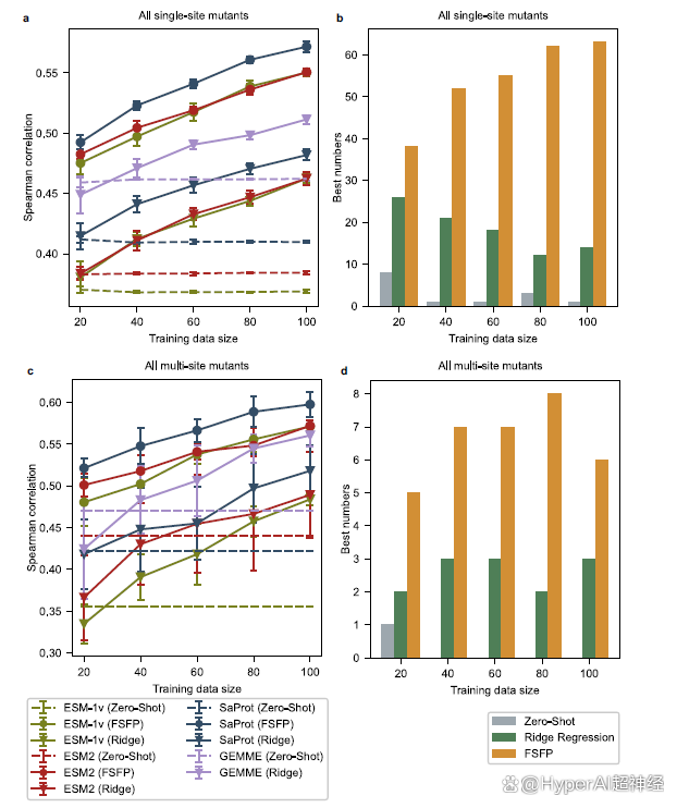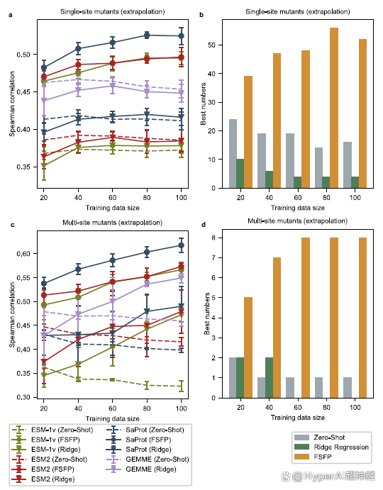 研究人员从每个原始测试集中选择所有单点突变体,其突变位点与训练示例不同,从而得到了一个与训练示例不同的单点突变体测试集。然后,研究人员选择个体突变与训练数据中的突变没有重叠的多点突变体,从而得到另一个具有挑战性的测试集。在这种设置下,研究发现基础模型的零样本性能明显地随着训练集大小的变化而变化。