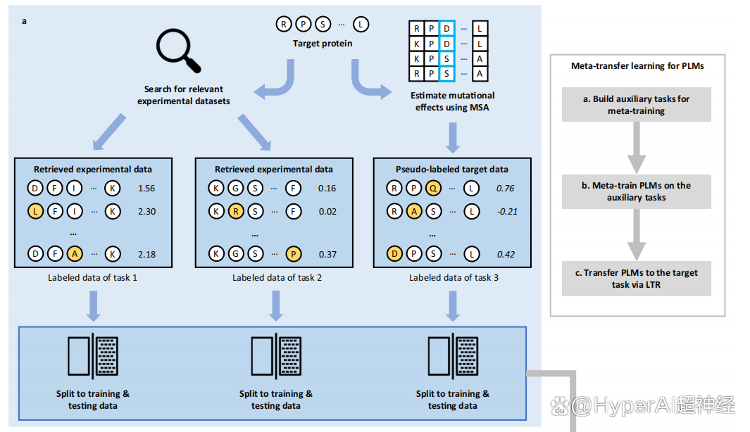 为了构建元学习所需的训练任务,该方法首先检索现有的标记突变数据集(labeled mutant datasets),从目前最大的 DMS 数据集公共集合 ProteinGym中检索出前两个与目标蛋白最接近的蛋白质的突变数据集,并使用基于MSA的 GEMME 打伪标签方法对目标蛋白质的突变信息进行评分,以构建第三个任务的数据集。这些数据集可能有助于预测对目标蛋白的变异效应,这些任务的标记数据随机分为训练数据和测试数据。
