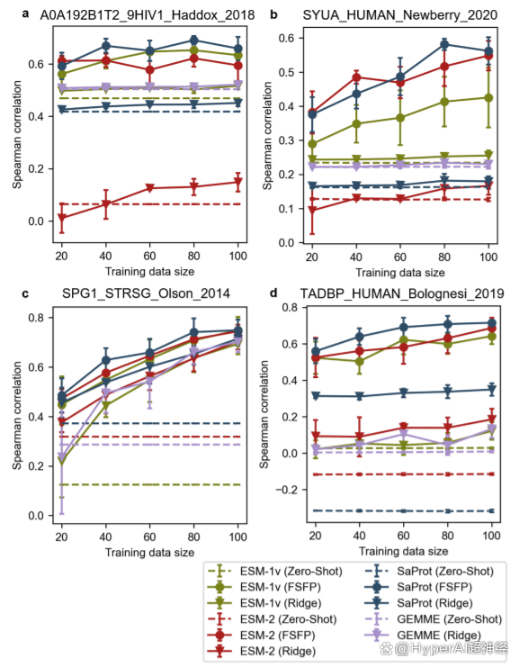 值得注意的是,对于 TDP-43 来说,所有零样本预测的 spearman 相关性都接近于零。除 GB1 外,大多数通过岭回归增强的模型,在更大的训练数据集上也没有显著的性能提高。相反,利用 FSFP 在小数据集上进行训练时,预训练模型可以获得相当大的收益。