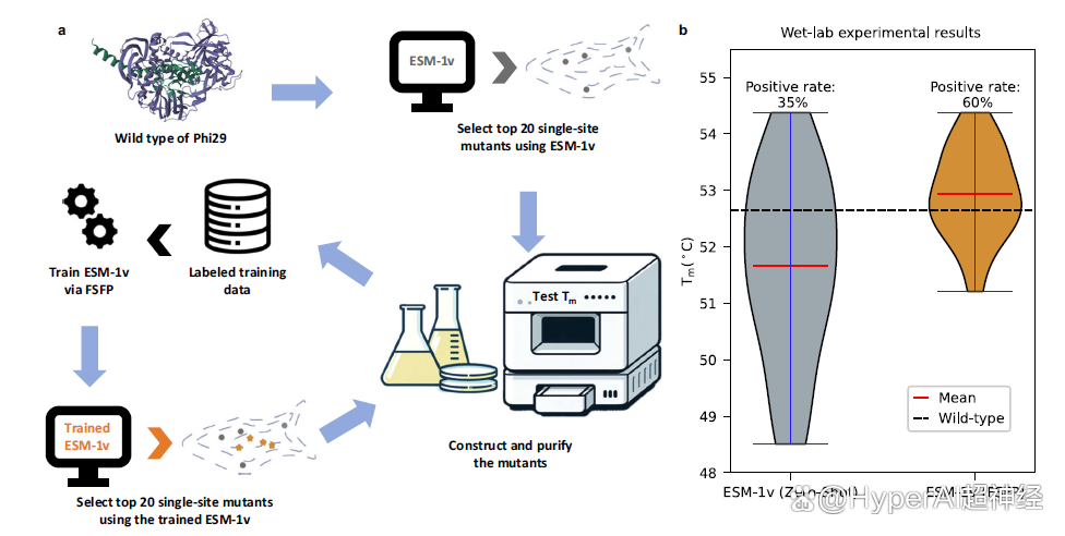 该研究还在一个具体的蛋白质 Phi29 改造案例中,进行了湿实验验证。基于一组有限的湿实验数据,该研究用 FSFP 对 ESM-1v 进行训练,用其寻找新的单位点突变体,并进行实验验证。对比 FSFP 训练前后 ESM-1v 的前 20 个预测结果,平均 Tm 值提高了 1 ℃ 以上,阳性率 (positive rate) 提高了 25%。