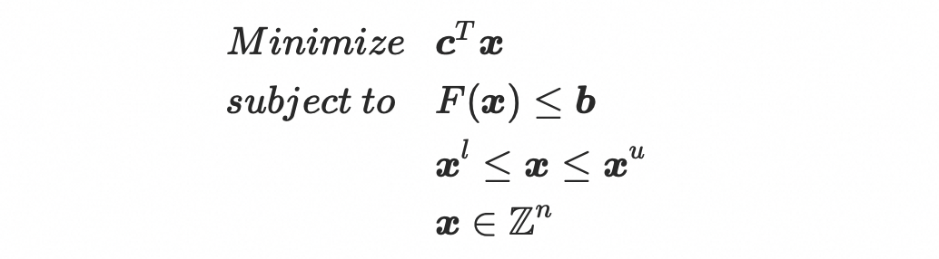 其中 , ,, 是输入, 是决策变量。 是多线性的,意味着任意变量的最高指数为 1。我们用 表示约束系统中的第 个约束为 : 。变量的边界表示为 ,并且我们表示 。在我们的问题中,, 是其对应供给节点的容量。给定变量 ,每个约束可以写成: