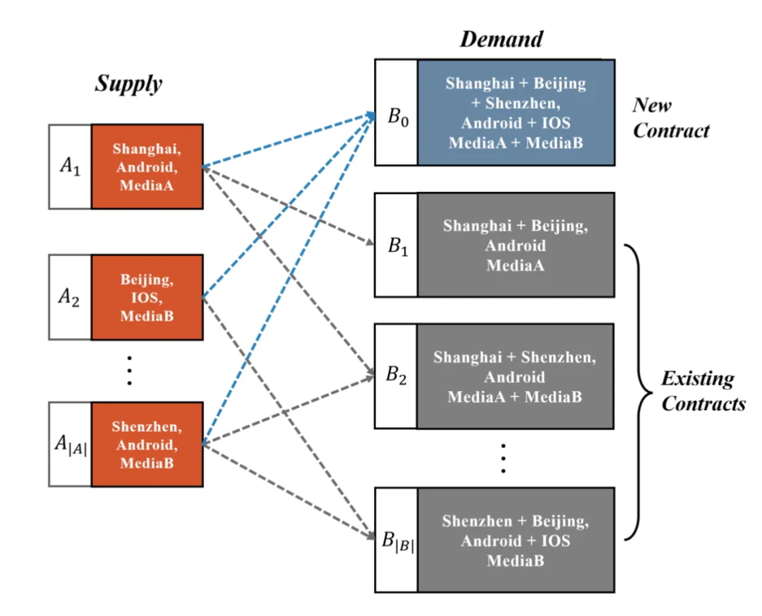 GD广告库存分配问题是计算新合同的最大可能展示量(库存),同时确保展示量满足发布商和广告商的需求约束。该问题可以使用二部图来描述,它可以使用二部图表示,如下图所示。在左侧,供给节点集对应于基本维度(城市 媒体 操作系统)的展示次数。在右侧,需求节点集对应于销售系统中的合同。其中,需求节点代表新合同,而其他需求节点代表现有合同。决策变量表示从供给分配到需求的展示次数。