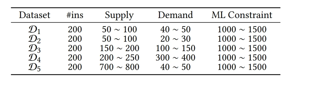 数据集:实验数据集来自阿里妈妈真实 GD 广告场景。通过对涵盖不同时间段(包括常规日和节假日)的实际在线请求数据进行采样和聚合生成 5 个数据集,以涵盖全面的业务场景。我们从所有样本中进行均匀随机抽样。实验数据的规模如下表:其中ins是例子的数量,ML Constraint是新引入的约束数量。