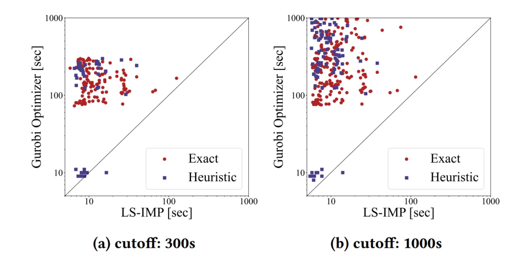 求解时间分析: 我们比较了 LS-IMP 和 Gurobi 求解器的求解时间,具体考察了它们在 300 秒和 1000 秒的运行时间,以验证我们算法的收敛速度。在这个分析中,我们比较了 Gurobi 的启发式和精确版本。可以观察到,无论在 300 秒还是 1000 秒的时间范围内,对于找到相同解决方案的实例,LS-IMP 始终能在更短的时间内获得解决方案。这表明了我们求解器的快速收敛速度。