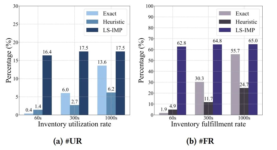 #UR 和 #FR 分析: 我们比较了每组实例的平均 #UR 和 #FR。结果下图所示。在商业场景中,GD 广告库存分配的销售实例通常需要在 60 秒内解决。可以看到,SCIP 和 Yuck 在解决这个问题上的效果相对较低,反映在业务解决时间内观察到的较低的 #UR 和 #FR 指标。为了验证和比较我们求解器的能力,还进行了求解时间延长到 300 秒和 1000 秒的实验。实验结果表明,尽管 Gurobi 在 #UR 和 #FR 上有所提高,LS-IMP 仍然是最具竞争力的算法。此外,从 300 秒和 1000 秒的求解时间结果来看,与 60 秒的 LS-IMP 结果相比,没有明显的改进。这表明 LS-IMP 基本在 60 秒内收敛,展示了我们算法的有效性。