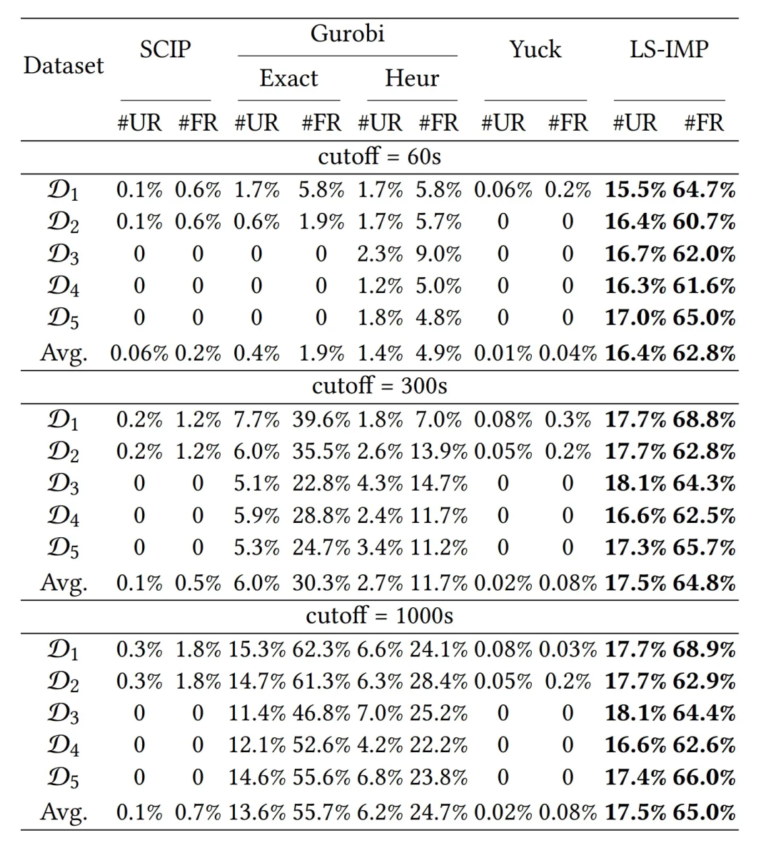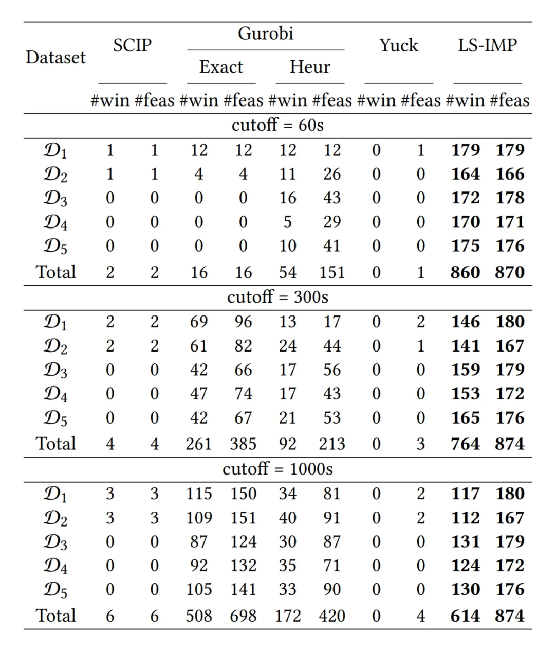 #win 和 #feas 分析: 可以观察到,在 60 秒内,LS-IMP 在可行解决方案的数量和获胜解决方案的数量上都具有显著优势。显然,SCIP 和 Yuck 在应用于可用数据集时,大多数实例无法提供可行的解决方案。作为商业求解器,Gurobi 在 60 秒的时间范围内,在可行解决方案的数量和找到的解决方案的质量方面都远远落后于 LS-IMP。即使在更长的时间(300 秒和 1000 秒)内,这两个指标仍然未能超越 LS-IMP。