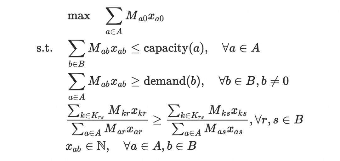 问题的目标是求解以最大化分配给新合同的展示次数,并满足三种约束条件: