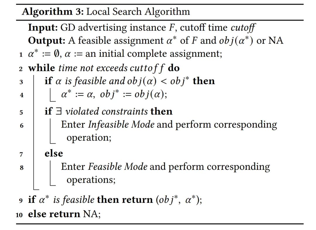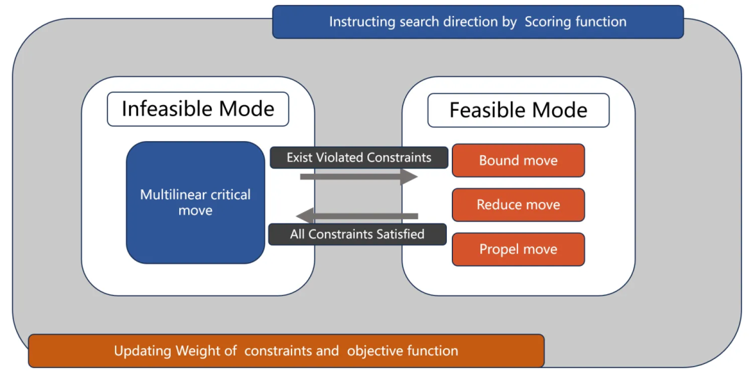 我们的算法采用双模式搜索框架,当存在约束不满足时,算法进入infeasile模式,在该模式下,通过多重线性算子来试图满足约束。当所有约束都满足的时候,算法进入infeasible模式,在该模式下,算法通过三种算子来降低目标函数的值。同时通过加权技术和设计的评分函数来指引好的搜索方向,从而加速搜索。