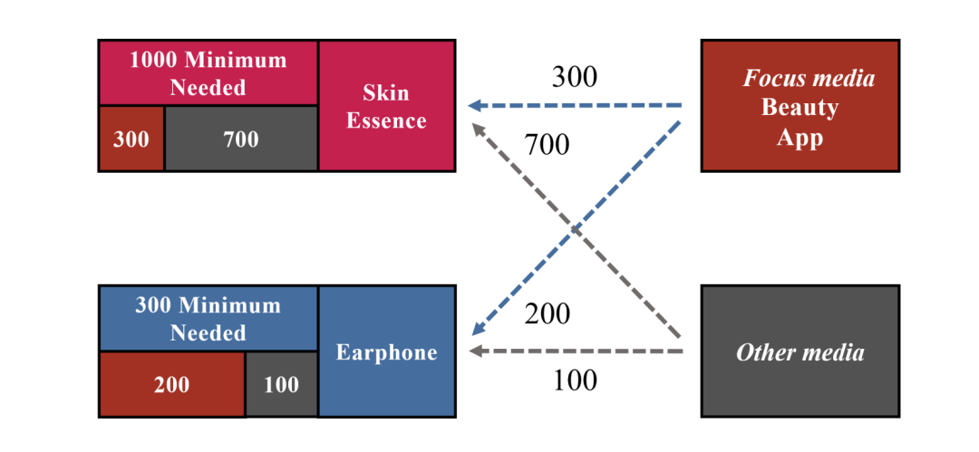 合约广告是在线广告行业的重要组成部分,它在品牌的在线商业营销和推广中起着至关重要的作用。广告库存的分配是合约广告的关键组成部分。广告客户通常会在广告投放日期的几个月或几周前与平台签订合同,以预先锁定所需的广告展示次数。合同中明确规定了在特定定向条件下(如人群、频次控制、城市、渠道)的广告展示数量。如果库存过度出售,可能导致无法完成合同中的展示数量目标,平台需要进行赔偿;而库存少售卖则会损害平台的收入。在以往的广告库存分配工作中,研究的重点仅限于包含线性约束。通常会利用线性约束的性质,利用对偶和KKT条件,快速解决问题。然而,这些算法只能处理线性或凸性约束。随着商业需求的不断扩大,越来越多的细化需求被提出,其中一些需求可以自然地表达为非线性约束,并且在数学形式上是非凸形式。举例来说,假设一个客户有两种产品,一个是护肤精华液,一个是耳机,并指定美妆app作为护肤精华液的重点媒体,相对于耳机来说。广告主希望护肤精华液在美妆app上的分配比例比耳机更大,使其更多地集中展示在合适的媒体上。