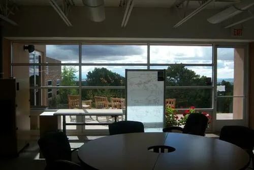 这间平房普通得不能再普通了,你若在山上看到绝对会以为这就是邻居家的大门,而决不会跟“研究所”三个字发生任何联系。直到我看到大门旁边一面不起眼的横幅上写着“Santa Fe Institute”几个英文字母,我才确信自己走对地方了。由于是周末,我不能走进这间平房的大门,便顺着旁边的小路绕行参观了这座著名的研究所。走了一段路之后,心中的疑惑才慢慢地消除。原来,小平房后面别有洞天,这个不起眼的研究所大门身后还有一大群建筑,它们曲折着往后面延伸。我绕着建筑缓步走着,不时地顺着玻璃偷眼向内望去。这一定是它们的图书馆,一排排整齐的书摆在墙边的架子上。这间是办公室,这间是讨论室……眼前的这面玻璃突然混浊不清了,定睛一看,原来是有人在这面玻璃上用彩笔画着各式各样的公式和图形——这帮美国人很有随处讨论、打草稿的习惯。再往前走,看到了屋檐底下的一张大桌子,周围还有一圈椅子。原来这是为学者们聊天、交流学术思想的地方。