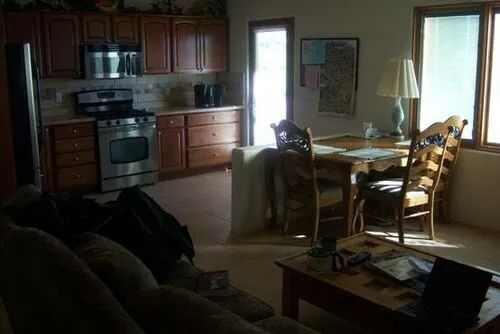 由于每年都会有很多学者访问圣塔菲研究所,因此,附近的住户都会将住房的一间以较低的价格出租给他们。我所住的房间就是圣塔菲研究所的Janet帮我联系的。我按照来信的指示,在门旁的一个小密码盒中找到了房门钥匙。打开门走进去,原始部落一样的住房里面却是现代化的装潢,大厅很宽敞,中间摆放着一个长条沙发。旁边还有灶台、微波炉、冰箱,里屋则是一张 King 号的大床,一切生活设施齐全。我舒服地倒在沙发上享受着这一切。