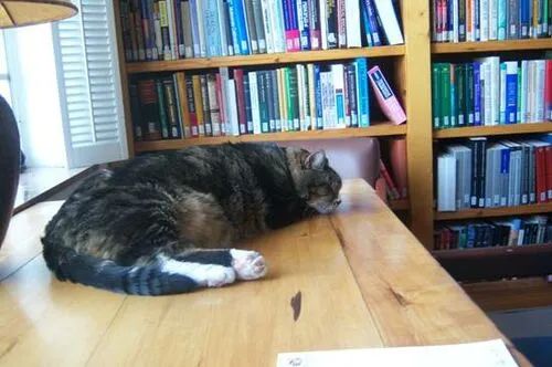 Fractal Space-Time and Microphysics: Towards a Theory of Scale Relativity这本书就是介绍尺度相对论的第一本书。我们知道尺度 (Scale) 是一种非常重要的概念。本书的作者Nottale正是抓住了这个核心概念,将尺度变换(Scale Transformation)与相对论中的运动参考系变换作类比,并指出分形中的尺度不变性具有普遍的意义,于是仿照相对论推出了一套全新的学科叫做:尺度相对论(Scale Relativity)。更有意思的是,作者希望通过这一观点出发,重新奠定量子力学的基础。随手翻着SFI图书馆中的图书,我深深地感慨到,这块不到60平米的地方基本上就是全世界复杂性科学的思想中心了。世界各地有关复杂系统的英文书籍在这里基本上都能找到,而且图书数量还在持续地增长着……相比较中国国内大学图书馆的藏书,这里的学科领域相对单一,基本上都是为了做研究准备的专业书籍,而看不到小说和杂志;另一方面,在专业书籍上,这里的藏书却远比中国国内的图书馆更加丰富多彩,更具包容性。国内可能比较关注实际技术理论的图书,但是这个图书馆的藏书则更加注重基础思想和内涵。比如计算机类的图书,国内的书籍大部分都是教你如何编程,然而这里的图书有很多都是关于计算的本质、人工生命、人工智能的哲学思考。我正沉思着在图书馆中缓缓踱步,突然听到了桌子后面传来了一阵阵呼噜声。“有人在睡觉?!”,我顺着声音看去,“没人哪!那是什么声音?”。走过去,仔细一看,原来是一只大肥猫在桌子上趴着睡午觉!
