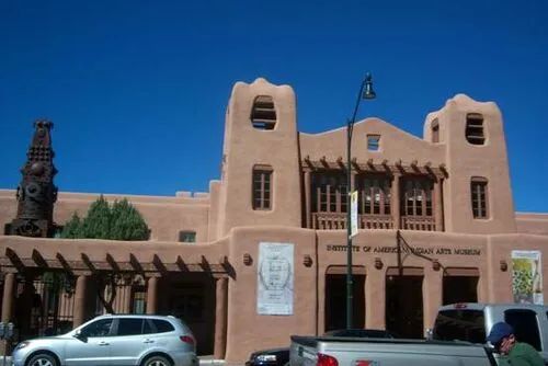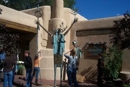 圣塔菲的建筑基本都是统一风格,最大的特点有两个:一个是所有的边角都呈现出圆弧形,另外,房屋多是棕红色的。这让我回想起了电影《星球大战之魅影危机》中的塔托尼星。街道上的行人和车辆熙熙攘攘,但是,总会有一些奇形怪状的雕塑显现。这些雕塑具有典型的印第安人文化风格,多半描绘着人们更加原始的一些生活方式。后来,我才知道,圣塔菲是除纽约之外美国最大的艺术城市。并且将近4/5的印第安人是居住在新墨西哥州的,所以这里能看到独具风格的印第安人艺术作品。
