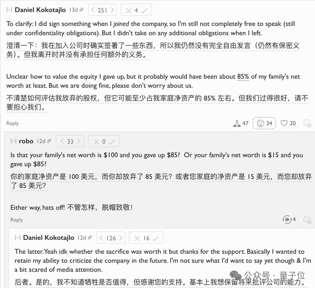 为了不承担苛刻的保密义务,他在离职时放弃了OpenAI的股权——这是一大笔钱,占到了他家庭资产的85%。