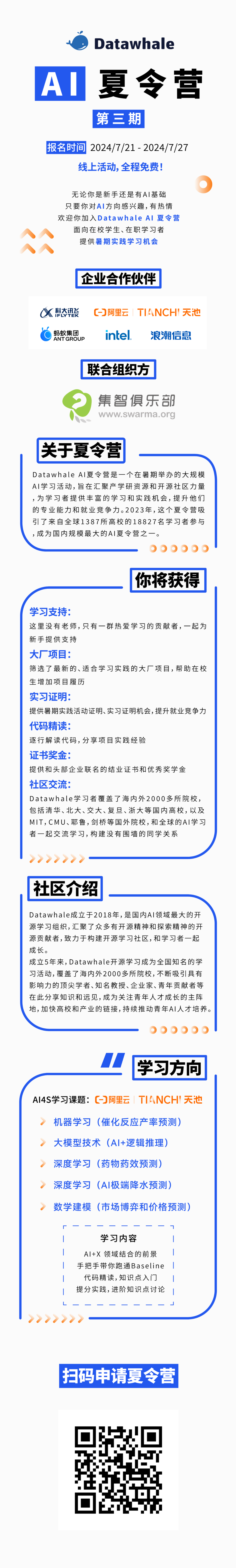 2024 AI夏令营,由Datawhale主办,联合科大讯飞、阿里云天池、蚂蚁集团、英特尔、浪潮信息等国内外顶尖人工智能企业。