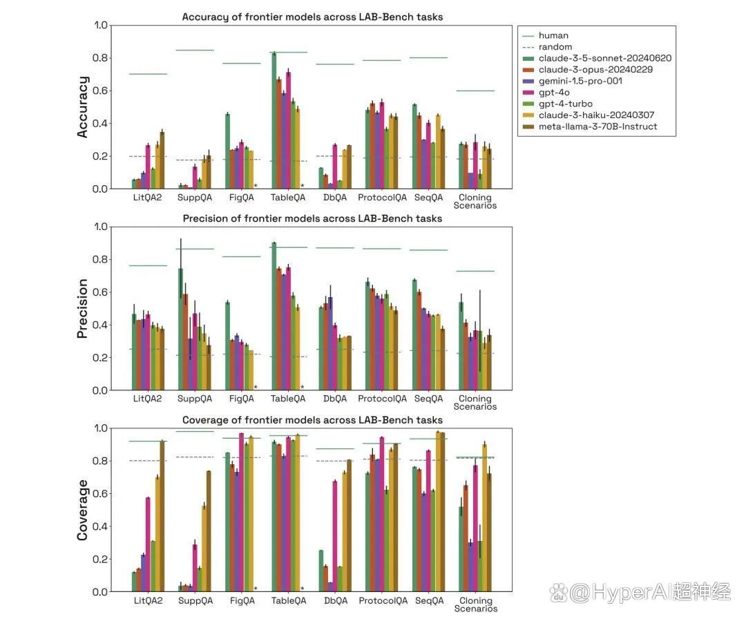 如下图所示,研究人员评估了 human、random、claude-3-5-sonnet-20240620、claude-3-opus-20240229、gemini-1.5-pro-001、gpt-4o、gpt-4-turbo、claude-3-haiku-20240307、meta-llama-3-70B-Instruct 在以上 3 类生物基准测试任务中的性能,并比较了它们的准确率 (Accuracy)、精确率 (Precision) 和覆盖率 (Coverage)。