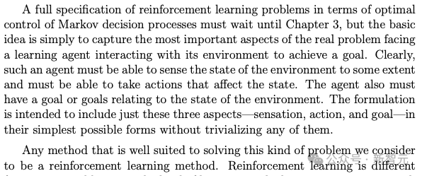 基本思想是,一个正在学习的agent与环境交互,如何捕捉到它面临的最重要的实际问题。 显然,这样的agent必须能够在某种程度上感知环境状态,且必须能够采取某种行动以影响状态。agent也必须有关于环境状态的目标。这一表述旨在包含三个方面:感知、行动和目标,以可行的最简洁的形式,而不会让任何一个方面只有平凡解。 任何适于解决这类问题的方法,我们都认为是强化学习方法。