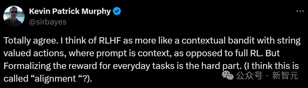 完全同意。我认为RLHF更像是行为(action)值是字符串的上下文多臂赌博机,其中提示词作为上下文,而不是完整的强化学习。但为日常任务制定明确的奖励机制是困难的部分。(我想这被称为「模型对齐」?)