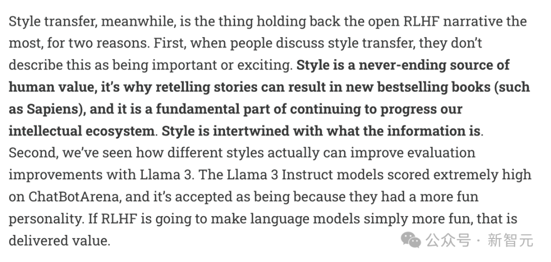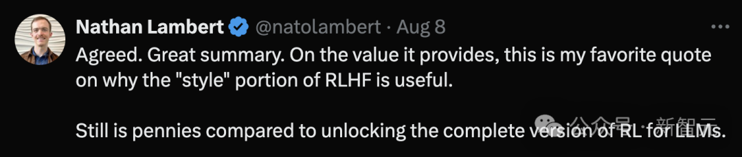 同意,很棒的总结。就其提供的价值而言,下面是我最喜欢的引用,说明了RLHF的「风格」部分为何有用。 但这与为LLM解锁完整版本的RL相比,仍然微不足道。